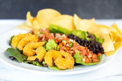 SOUTHWEST BOWL – Crisp greens, crispy corn shrimp or shredded chicken, pico de Gallo, black beans, sliced avocado, corn chips and served with chipotle ranch dressing – $17.95