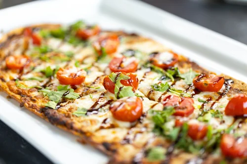 MARGHERITA – Tomato pesto with tomato, red onions Bacio cheese topped with arugula and a balsamic glaze – $17.95
