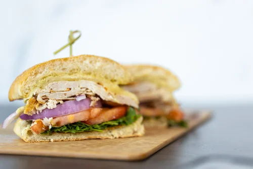 CHIPOTLE CHICKEN & AVOCADO – Chipotle marinated chicken topped avocado, Bacio mozzarella, tomato, arugula and chipotle mayo – $16.95