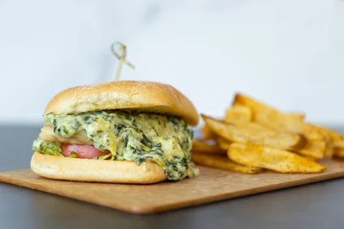 Our Smashburgers are 1/3 pound of Certified Hereford Beef. All burgers are served on a Brioche Bun. Gluten free bun available upon request (+$2). Served with Super Skinny Fries, Signature Fries or Fairway Fries. Upgrade to Sweet Potato Fries with homemade honey maple sauce (+$1) or Onion Rings (+$2).