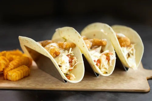 Petite flour tortillas filled with your choice of crispy corn shrimp, pork Carnita or crunchy chicken, a Pico de Gallo slaw, drizzled queso and roasted poblano avocado sauce on the side