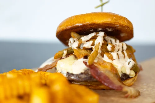 PEPPADEW BURGER – Melted mozzarella cheese, bacon, peppadew and onions, with our secret peppadew sauce, drizzled with hot honey – $17.95