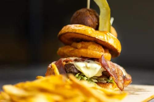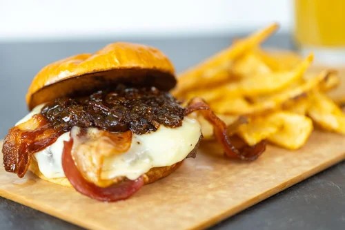 STUFFED – 2/3-pound patty stuffed with smoked gouda, Gruyere & smoky bacon, topped with caramelized onion and homemade bacon butter on a grilled brioche – $18.95